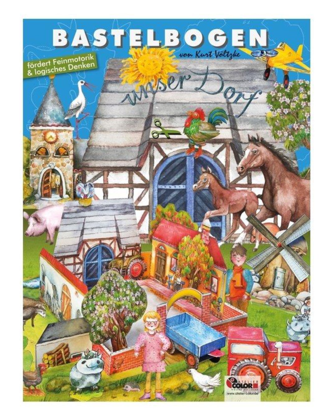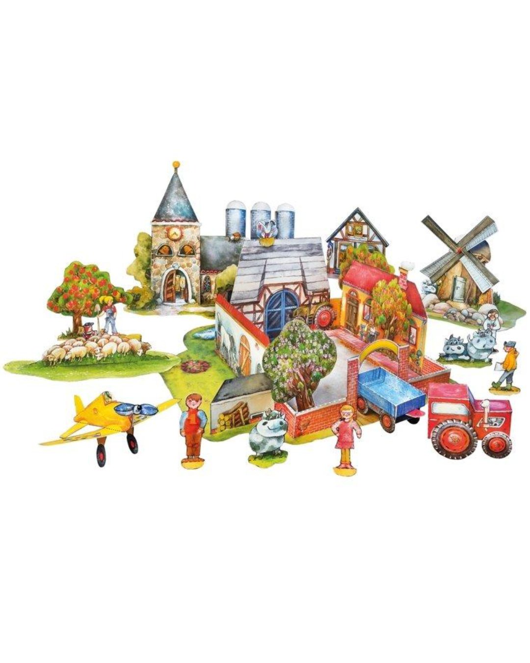 Das Dorf ist handillustriert, mit Bauernhof, Kirche, Windmühle, Silo, Gasthaus und Flugzeug, Traktor, Tiere Figuren aus robustem Papier.