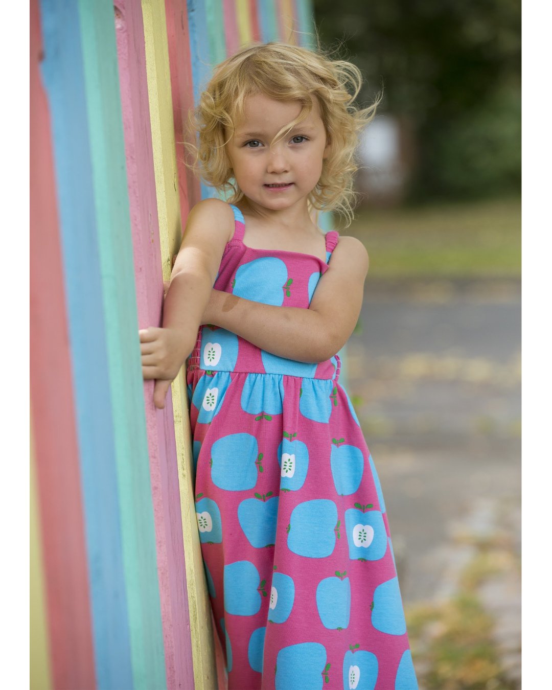 Das pinke Kleid mit den leuchtend hellblauen Äpfeln ist ein besonders niedliches Kinderkleid und aus weicher Biobaumwolle.