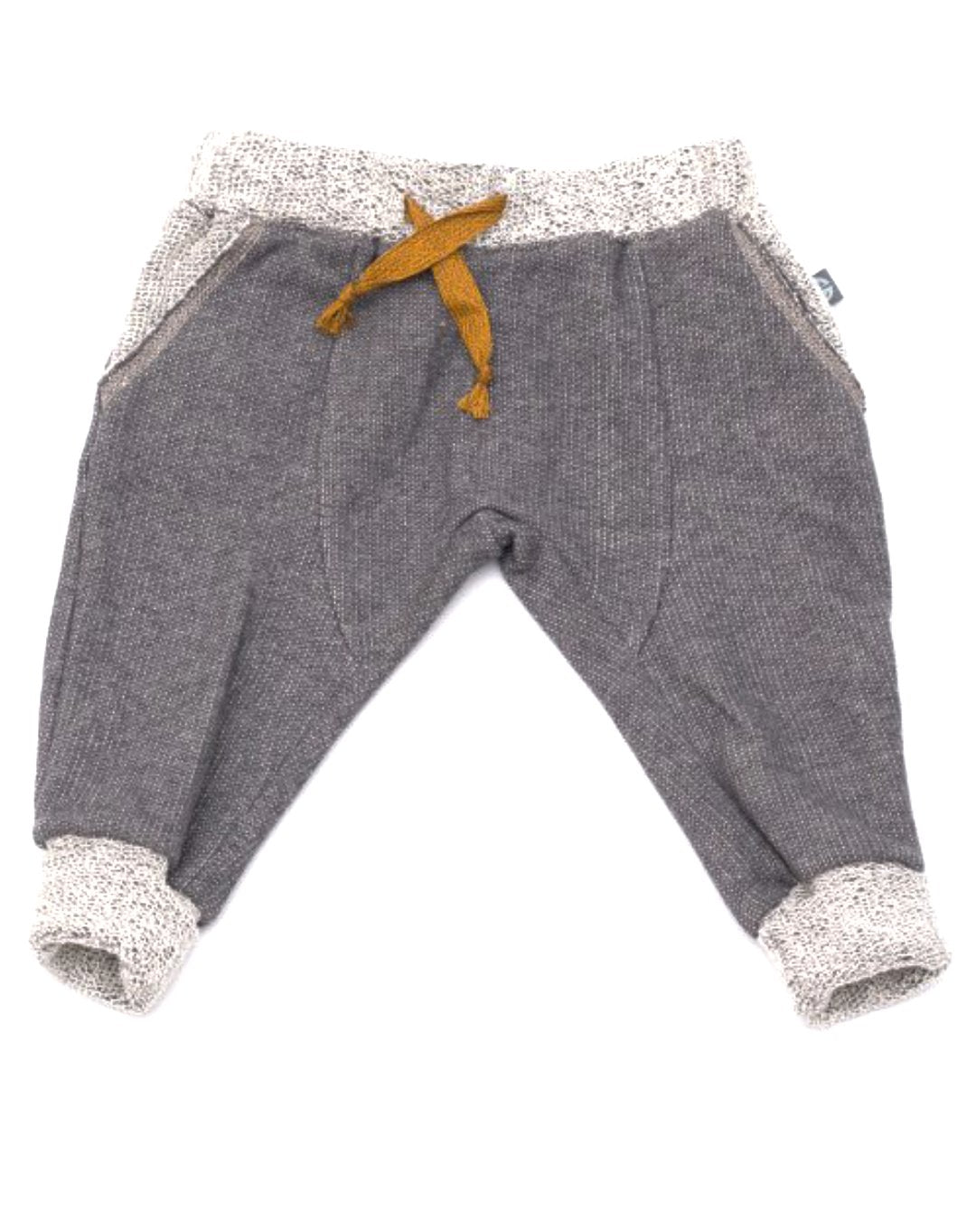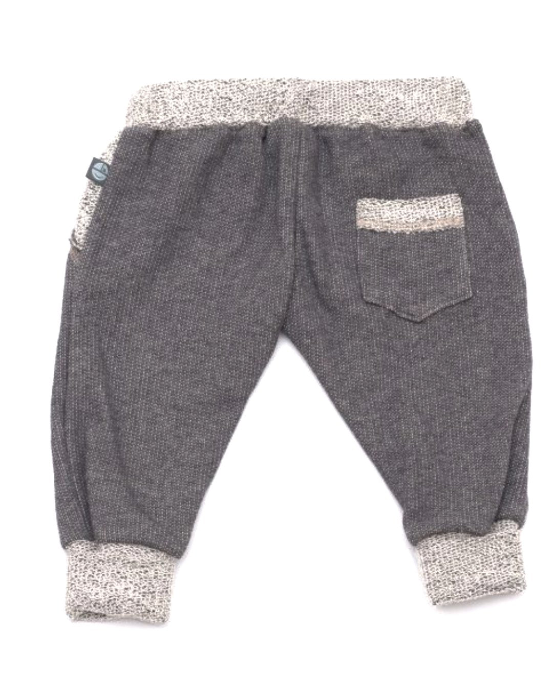 Vorne hat die Sweathose zwei Taschen und hinten eine aufgesetzte Gesäßtasche. Durch den Gummibund und die braune Kordel ist die Hose am Bund variabel.